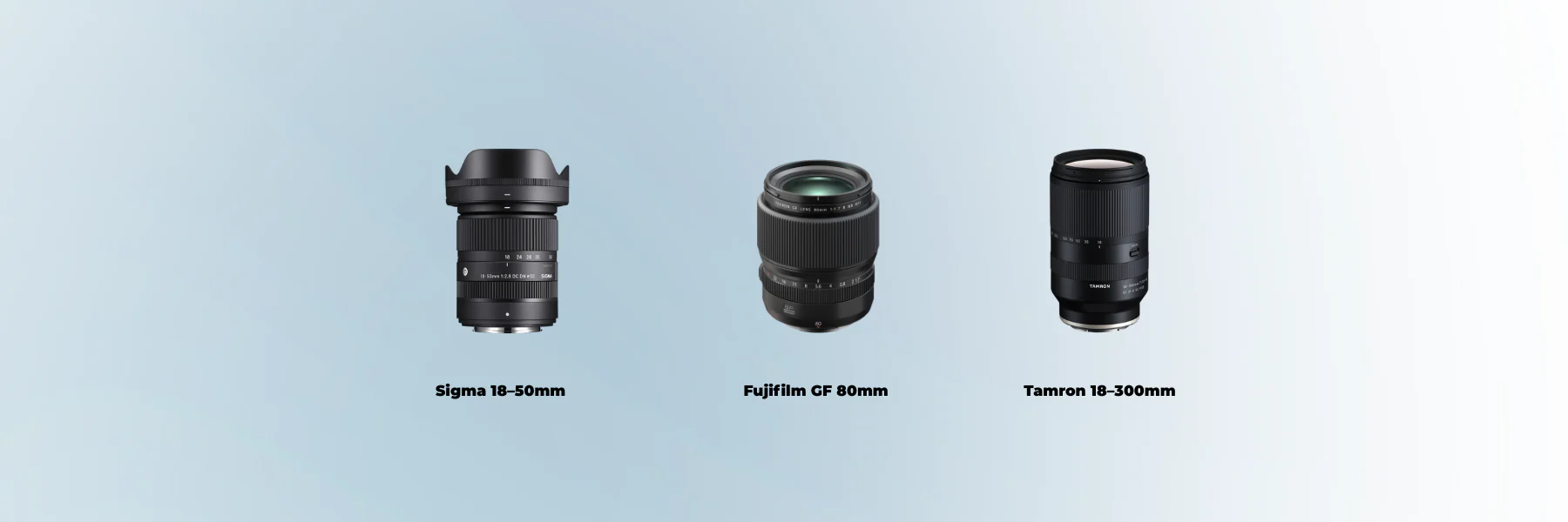Choosing a lens is often more important than choosing the camera itself. Today we compare three very different but highly popular lenses: the Sigma 18–50mm f/2.8, the Fujifilm GF 80mm f/1.7, and the Tamron 18–300mm f/3.5–6.3.
